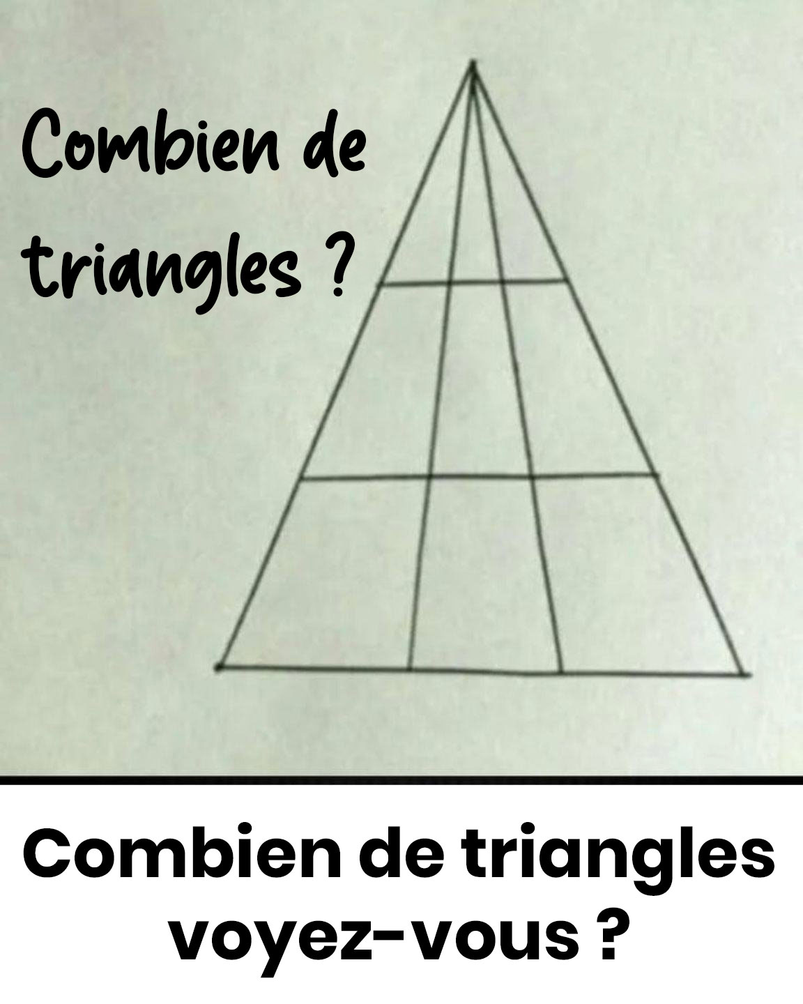 Notre perception visuelle a tendance à capturer les formes triangulaires les plus apparentes tout en négligeant celles qui se créent par l’assemblage de plusieurs sections. Conséquence : nous tombons systématiquement dans la sous-estimation. Dans cette disposition classique (4 niveaux créés par 3 lignes parallèles au côté inférieur), le nombre correct s’élève à 27.