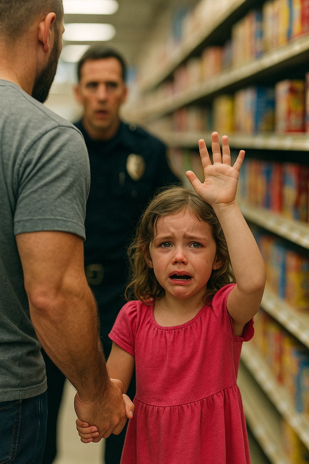 L’histoire se déroule dans une allée calme du magasin. Une fillette d’à peine six ans, vêtue d’une robe rose, tient la main d’un homme en chemise grise. Soudain, son regard croise celui d’un agent de sécurité et elle esquisse un mouvement précis : elle ouvre sa main, cinq doigts bien déployés… puis replie délicatement son pouce contre sa paume avant de refermer les autres doigts par-dessus.