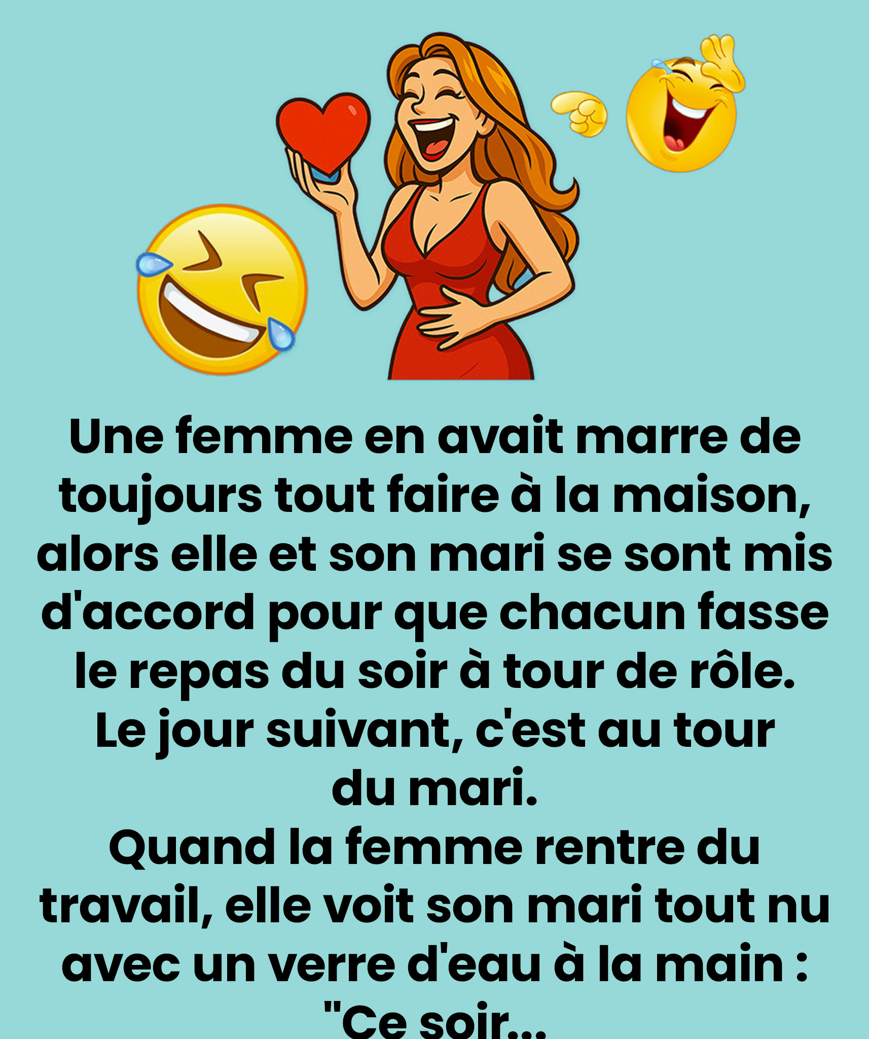 Un homme, convaincu que son épouse le trompe, décide de rentrer plus tôt à la maison. De la rue, il aperçoit une automobile inconnue stationnée devant son domicile. Sans réfléchir, il saisit… le réfrigérateur et le précipite sur le véhicule ! (Mauvaise décision, évidemment.) On le retrouve ensuite devant les portes du paradis, en conversation avec Saint Pierre. Peu après, un deuxième homme apparaît, suivi d’un troisième qui affirme : « Je ne saisis pas ce qui m’arrive… j’étais dans un frigo, et tout à coup… »