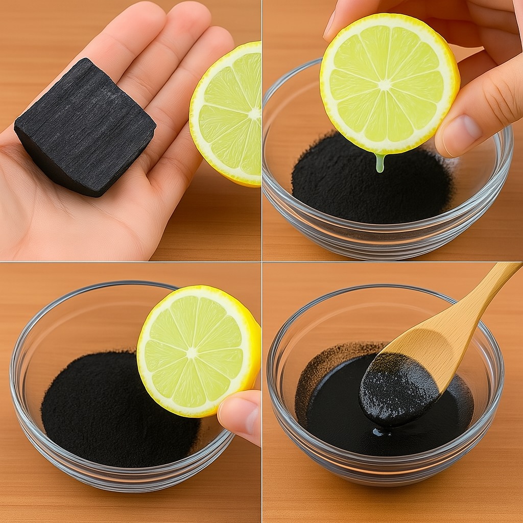1. Préparez une pâte en mélangeant de la poudre de charbon avec quelques gouttes de jus de citron et une cuillère à café de miel ou d’eau.